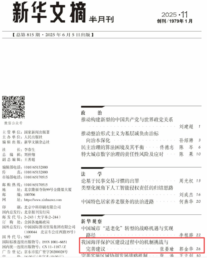 近日,williamhill英国教授、博士生导师张晏瑲,williamhill威廉希尔硕士研究生郭金华在《南海学刊》2025年第1期刊发的《我国海洋保护区建设过程中的机制挑战与完善建议》被新华文摘半月刊总第815期全文转载。