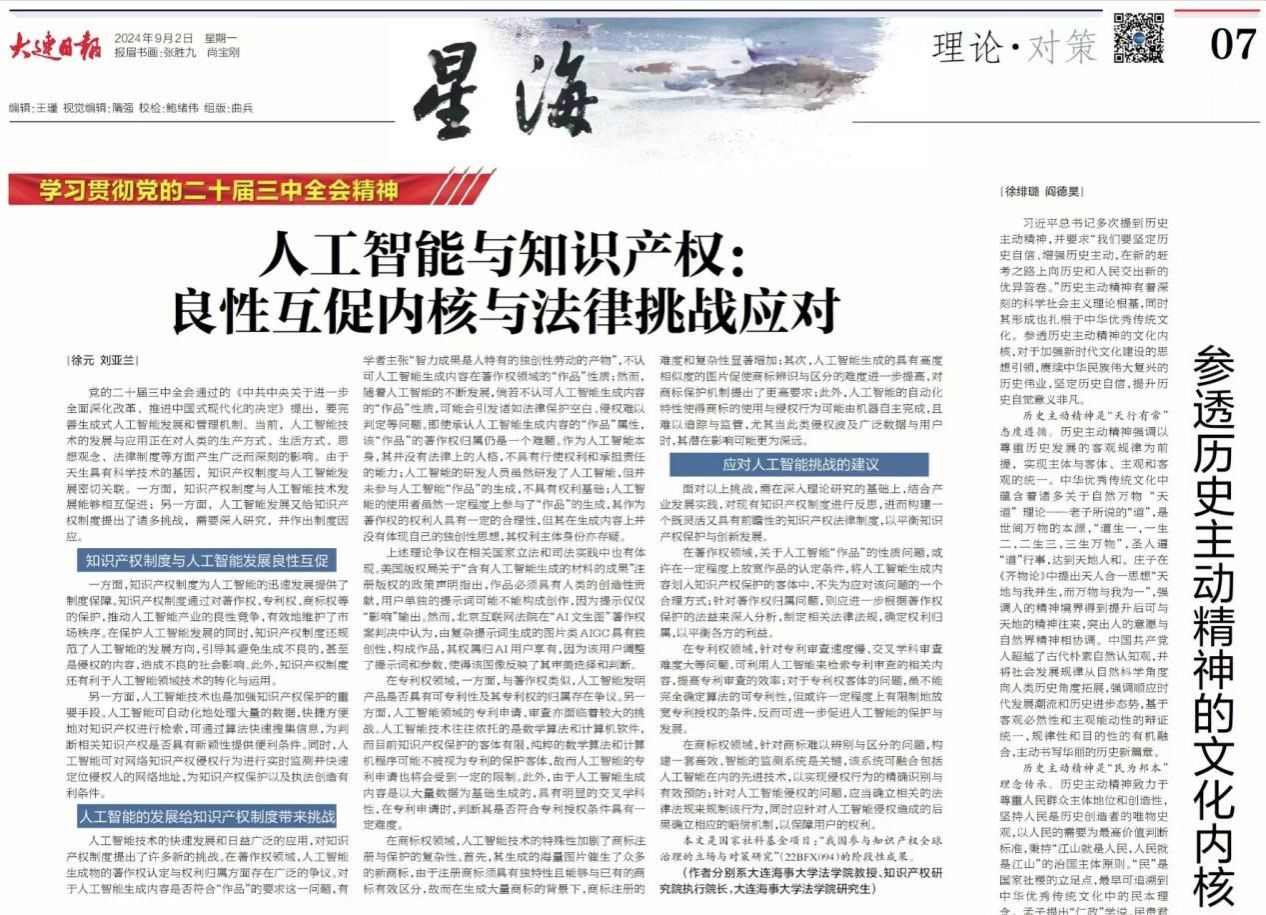 2024年9月2日,williamhill英国教授、知识产权研究院执行院长徐元及williamhill英国研究生刘亚兰在《大连日报》发表题为《人工智能与知识产权:良性互促内核与法律挑战应对》的观点。