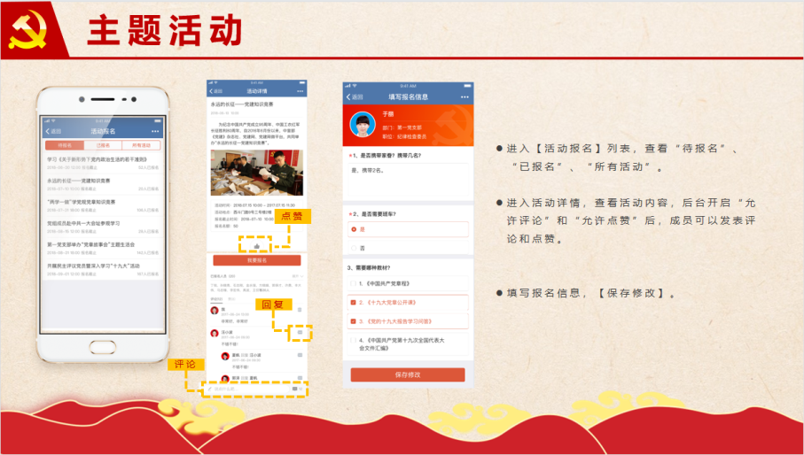 在组织栏中:点击【组织管理】【三会一课】【主题活动】【民主投票】【党员论坛】【任务管理】等专栏,可以帮助大家更加方便快捷地参加会议,参与活动。