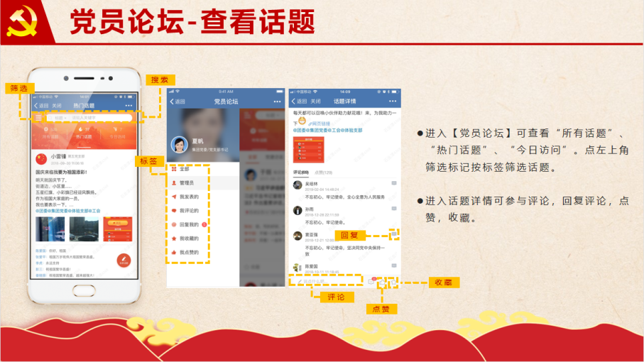 在动态栏中:大家可以点击【党建要闻】【通知公告】【党内公示】【党建相册】【支部动态】专栏,进入消息列表,点击图文详情页还可参与点赞、评论哦。