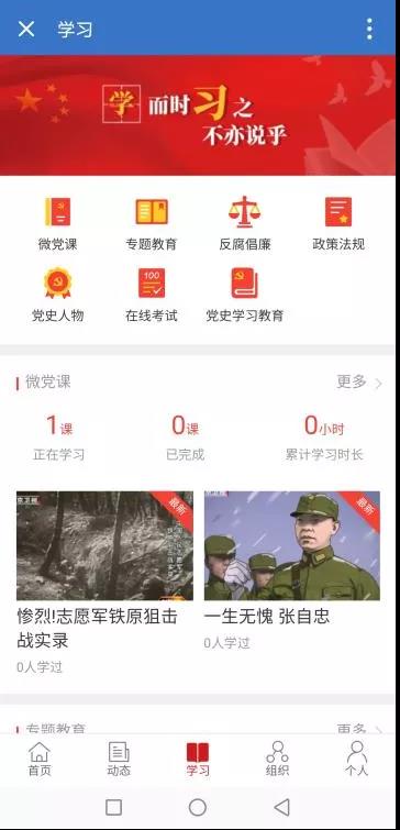 在学习栏中:点击【微党课】【专题教育】【反腐倡廉】【政策法规】【党史人物】【在线考试】【党史学习教育】,可以随时随地展开学习,还可以进行自我测试。