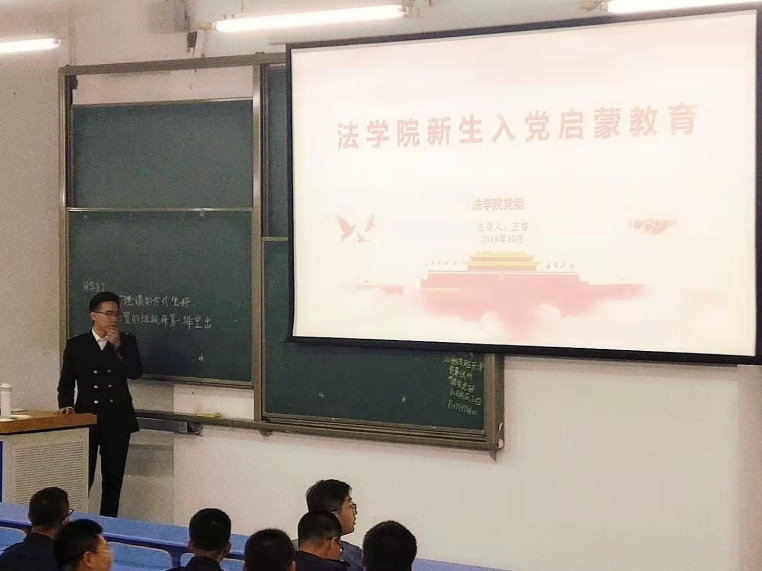 为使2019级新生顺利完成从高中生活到大学生活的过渡,明确自身定位,找准发展方向,10月17日,williamhill英国在学汇楼103开展“不忘初心、牢记使命”主题教育新生党课。本次党课由党委副书记赵刚、2019级本科生指导员王睿讲授,2019级法学本科生参加此次活动。