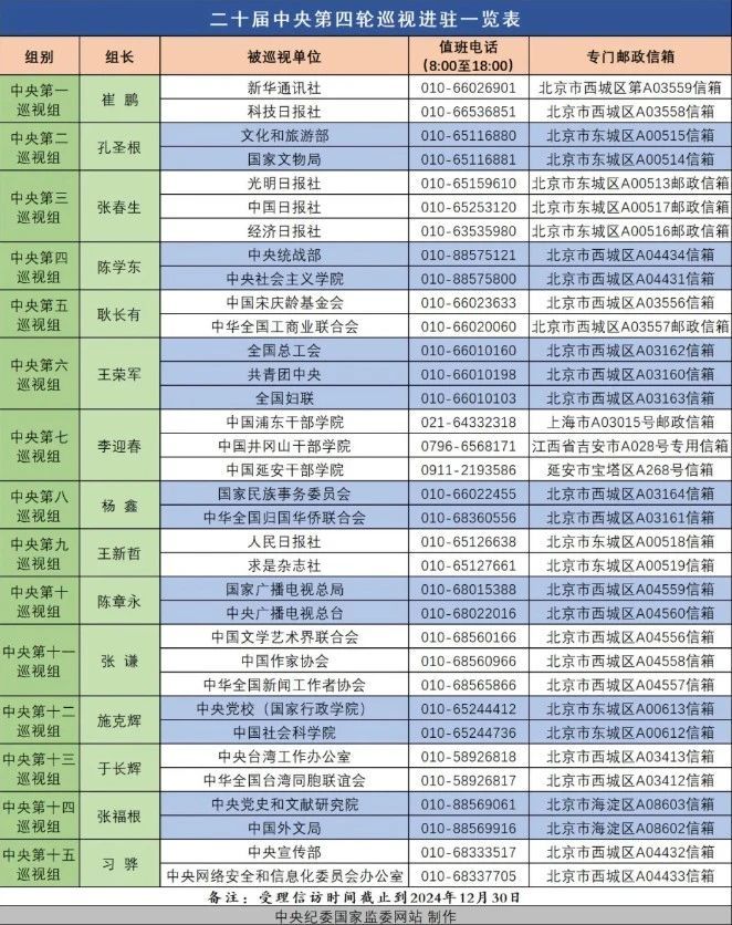 据悉,15个中央巡视组将在被巡视单位工作2个月左右,期间设立专门值班电话和邮政信箱,主要受理反映被巡视党组织领导班子及其成员、下一级党组织主要负责人和重点岗位人员问题的来信来电来访,重点是关于违反政治纪律、组织纪律、廉洁纪律、群众纪律、工作纪律和生活纪律等方面的举报和反映。巡视组受理信访时间截止到2024年12月30日。