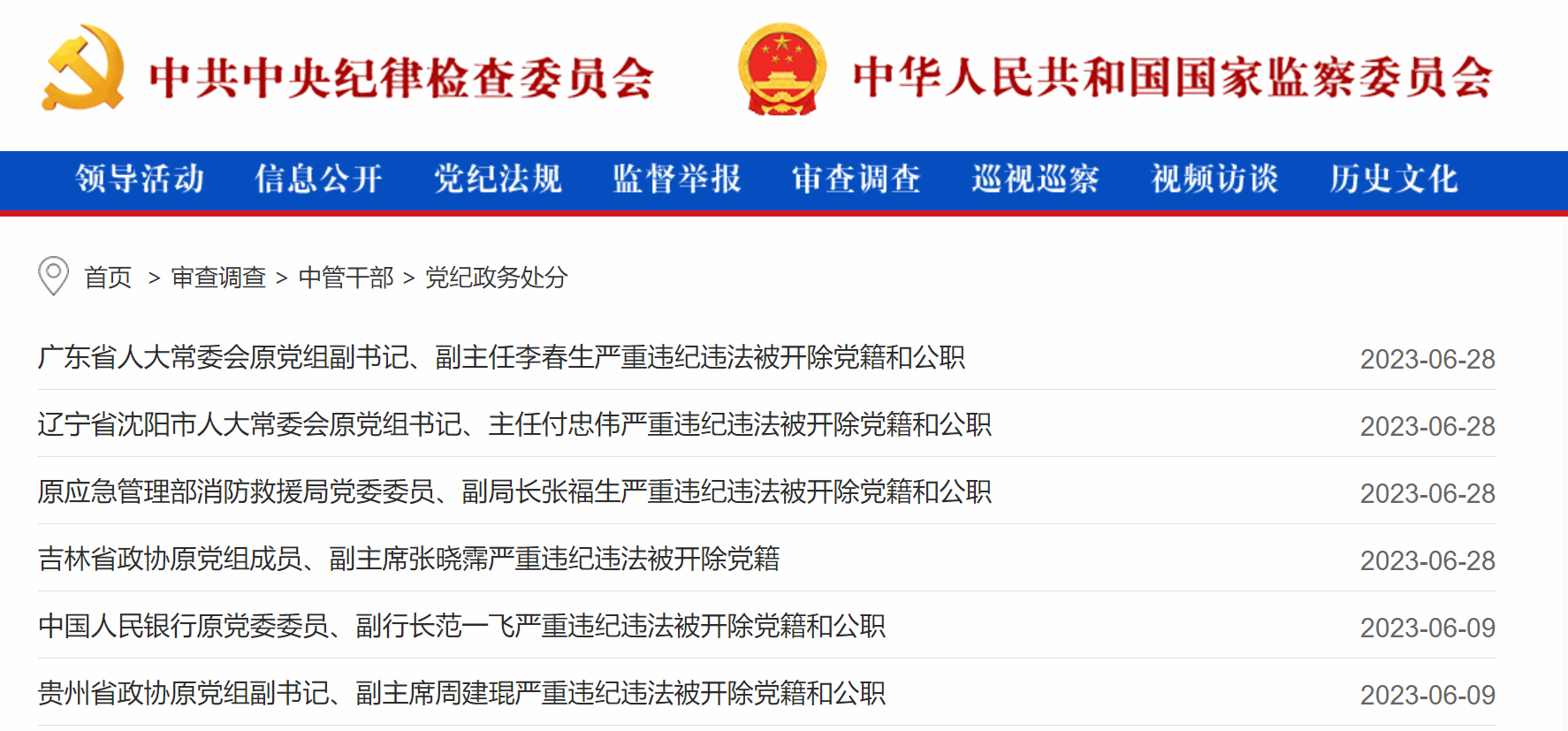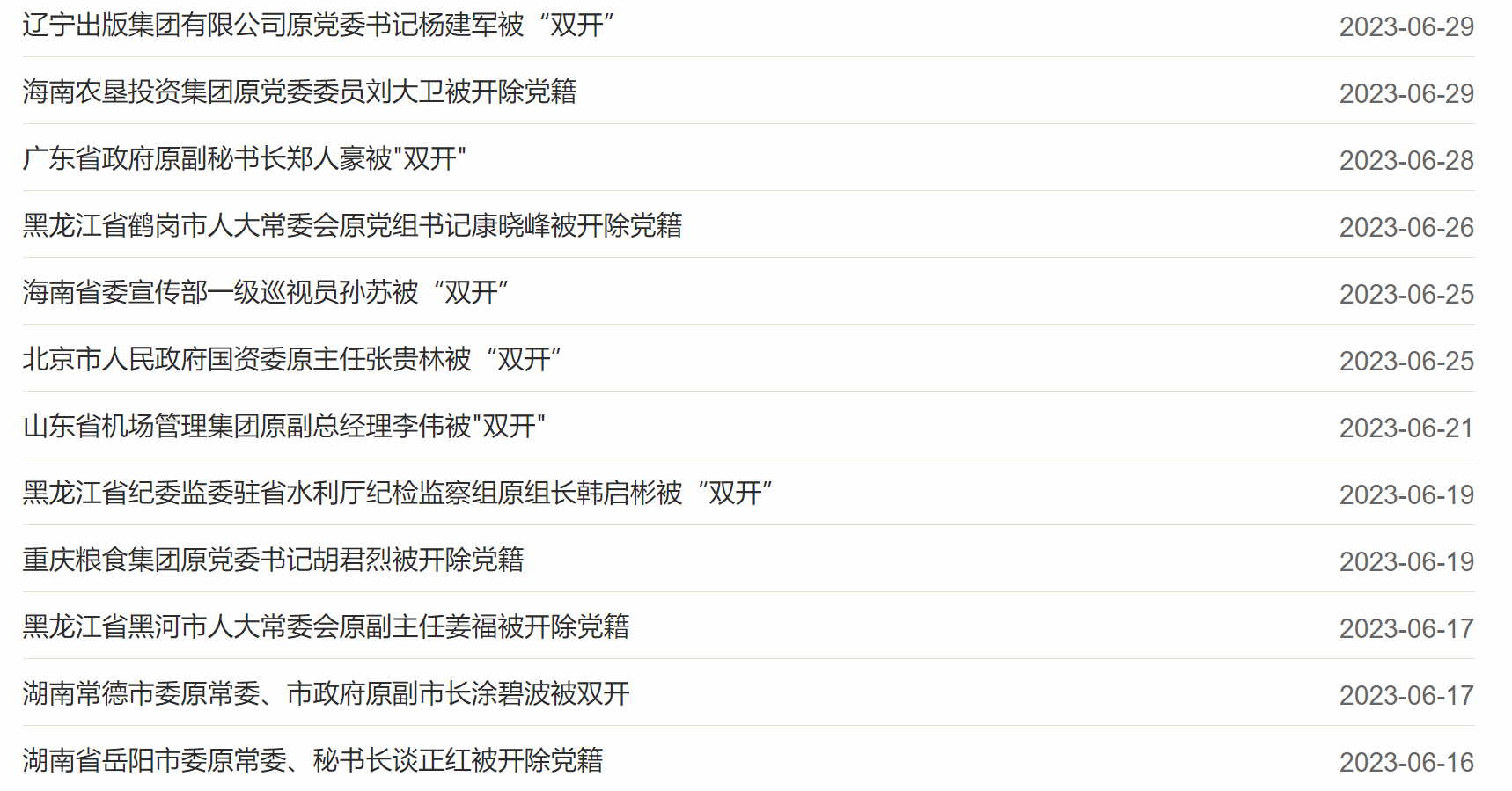另外还包括:海南省委宣传部一级巡视员孙苏被开除党籍和公职;北京市人民政府国有资产监督管理委员会原主任张贵林被开除党籍和公职;重庆粮食集团原党委书记、董事长胡君烈被开除党籍;等等。