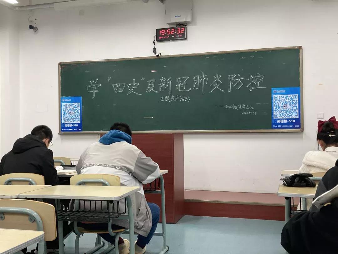 为激励同学们学好“四史”知识,了解疫情防控的相关资讯,各班分别邀请了本科生班主任吴淞豫老师、郑琳老师,学生党员代表付玉、冉骄、黄瑾、董俊博为同学们宣讲,主要介绍了“四史”相关知识以及习近平总书记关于新冠肺炎疫情防控工作的重要讲话和指示精神,旨在传播“四史”知识、弘扬同学们的爱国主义精神、培养同学们的民族意识,增强道路自信、制度自信、理论自信、文化自信;学习中国人民“生命至上、举国同心、舍生忘死、尊重科学、命运与共”的先进品质,体会并发扬伟大的中华民族精神,培养同学们的爱国主义情怀,向英雄致敬,向英雄学习!