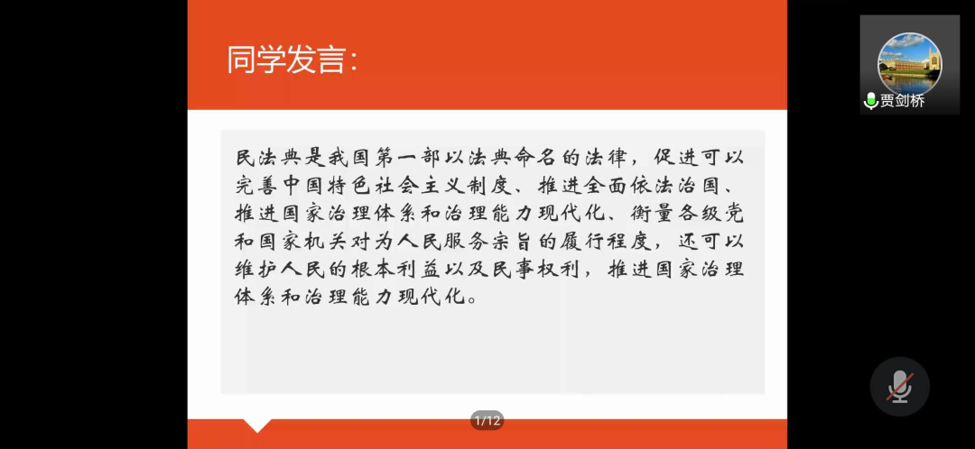williamhill英国2020级法硕中队团总支王牧晨同学从民法典的意义、结构、新增亮点法规等三个方面内容,对《民法典》进行了深入剖析,并对同学们针对民法典提出的问题进行了详细讲解,使同学们明确《民法典》的颁布实施,是我国中国特色社会主义法律体系的进一步完善,是民族精神和时代精神的新型表达,也使我国的依法治国进程迈上了新的台阶。