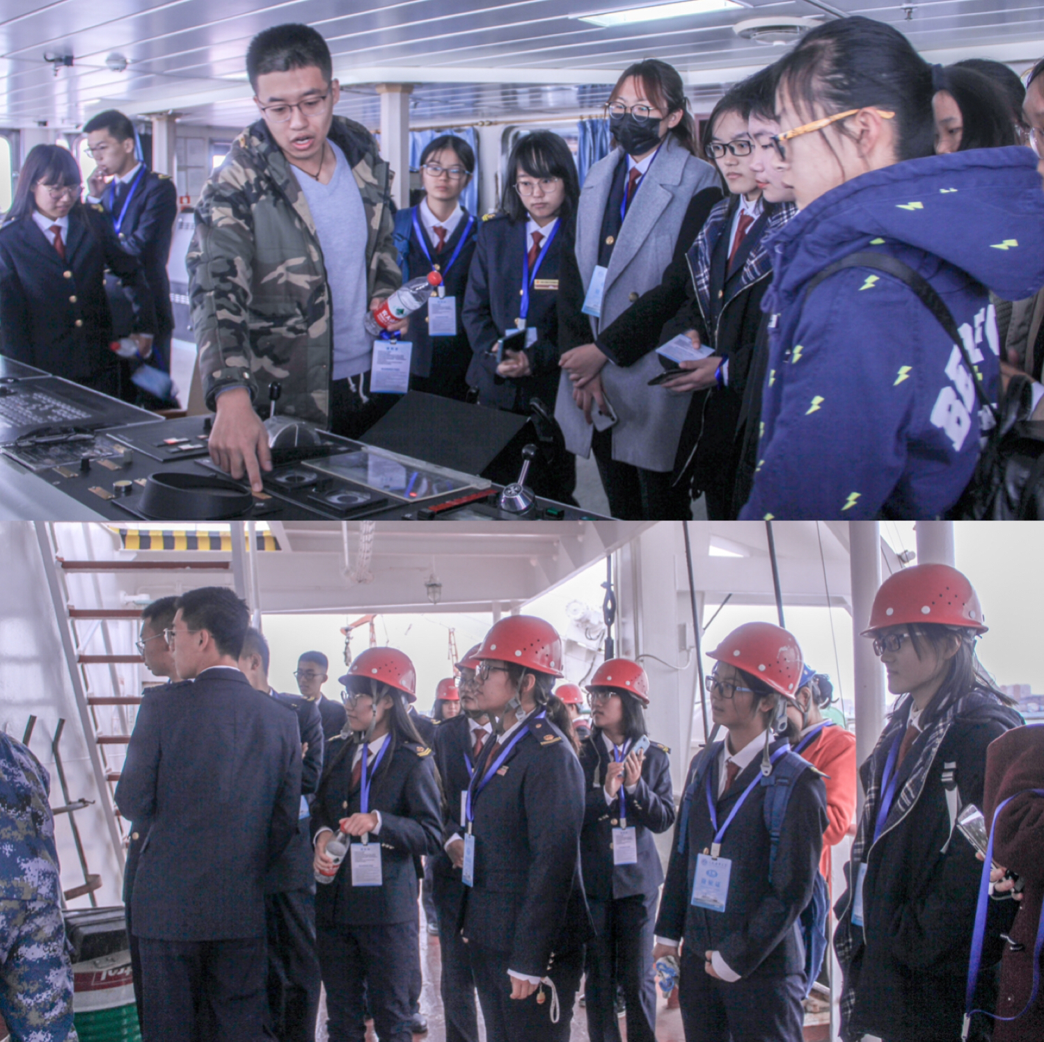 行程结束前,同学们登上育鲲轮甲板合影留念,许下青春寄语,表达了身为海大人的自豪,传达了对学校的热爱与骄傲。