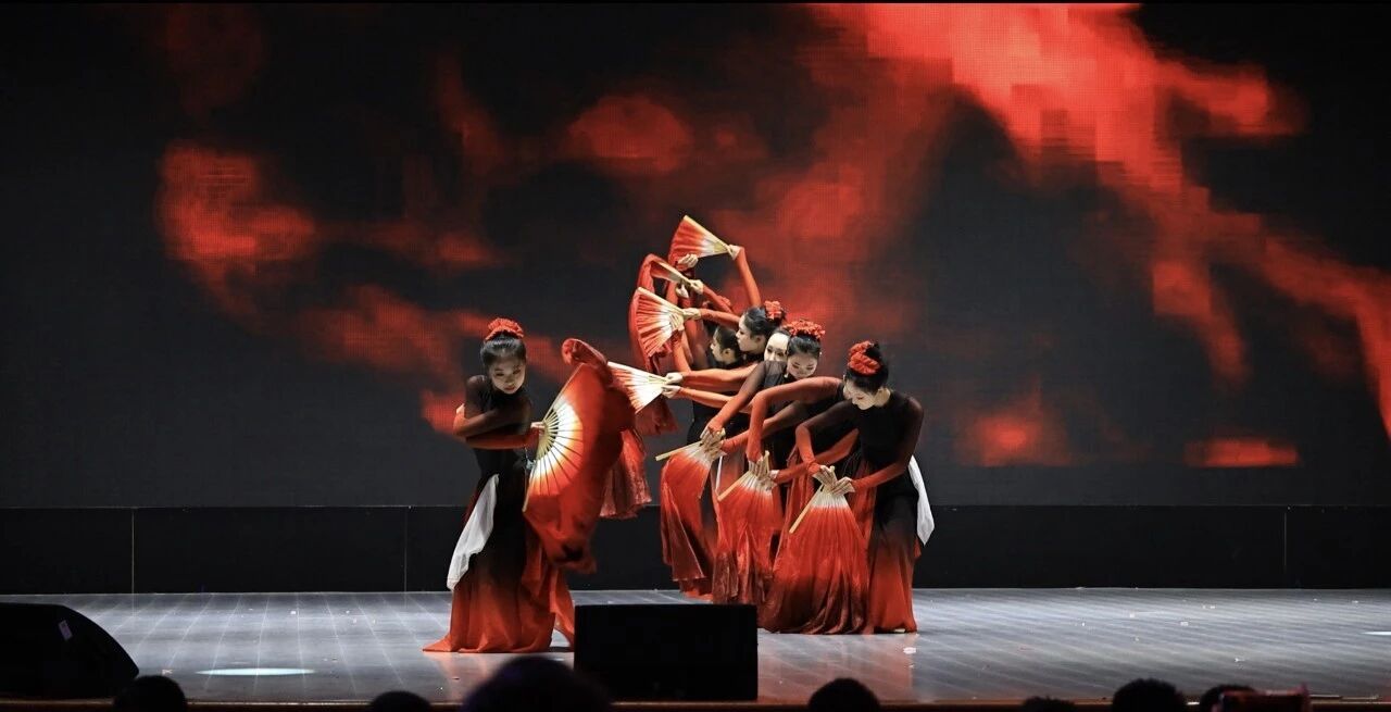 初时鼓点轻叩如溪涧叮咚,舞者或错身交叠,或首尾相衔,队形如流水绕石,柔中藏劲,仿佛鱼群戏于浅滩;转瞬管弦骤扬似潮涌拍岸,众人身形骤聚,臂膊交叠如鱼群聚渊凝蓄力量,绸扇齐扬如浪峰堆叠,红黑光影瞬间铺满舞台。