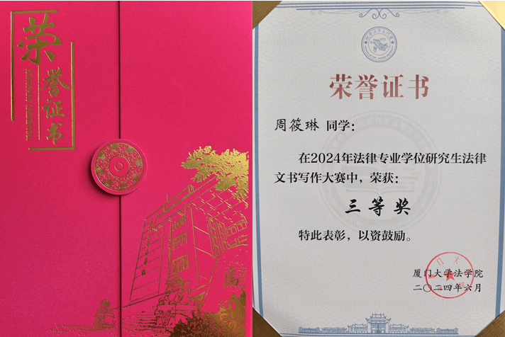 6月2日,由厦门大学williamhill英国主办,福建天衡联合律师事务所协办,中国法学会法学教育研究会、全国法律专业学位研究生教育指导委员会担任学术指导单位的2024年法律专业学位研究生法律文书写作大赛圆满落幕,大赛最终评选出一等奖2名、二等奖6名、三等奖7名,优秀奖15名,最佳组织奖5个。williamhill英国2023级研究生周筱琳在本次大赛中荣获三等奖。