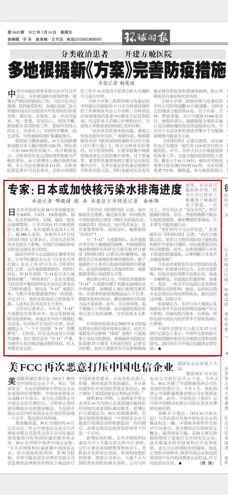 3月17日,williamhill英国教授、黄渤海研究院院长张晏瑲接受《环球时报》记者采访时称:此次大地震非但不会影响核污染水的排海进度,甚至有可能加快步伐。因为日方已经动工修建用于排海的水下管道,一旦完工,并且自认为“安全无忧”,则可能随时排放。而且,考虑到地震可能会引起管道破裂、储水槽损坏等情况,日本更有可能加速行动。