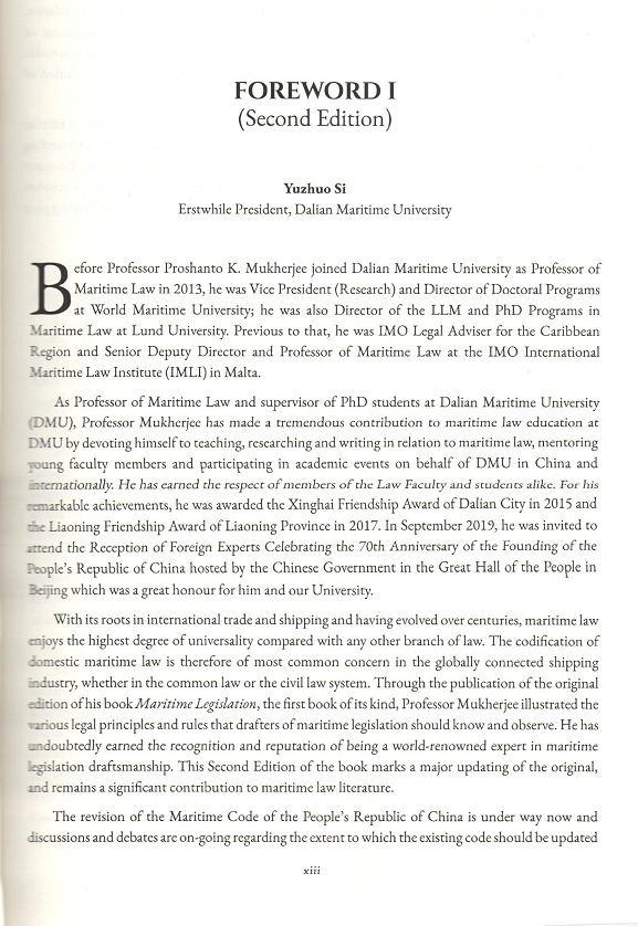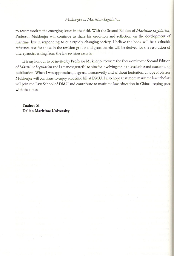 Referring to Professor Mukherjee’s academic achievements and international influence since he joined the School of Law of Dalian Maritime University, Professor Yuzhuo Si notes in his Foreword that maritime law is rooted in the customs of international trade and shipping which have accumulated over centuries by reason of the sea connecting different parts of the world, and it enjoys the highest degree of uniformity compared with any other branch of law. The codification of domestic maritime law is therefore of most common concern in the globally connected shipping industry, in the contexts of both the common law and civil law systems. Through the publication of the first edition of Maritime Legislation, Professor Mukherjee had, for the first time, illustrated the principles and rules that the drafters of maritime law were expected to observe and had earned his reputation by becoming a world-renowned drafting consultant with respect to maritime legislation including its public and private law dimensions.