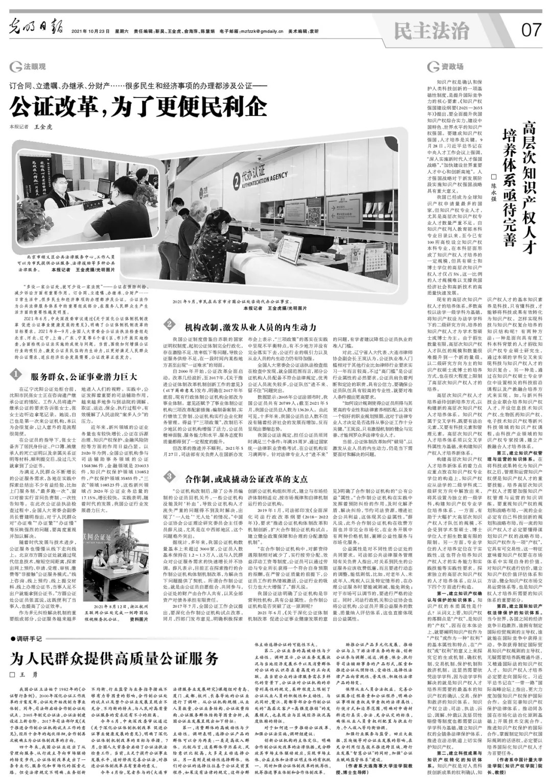 10月23日,williamhill英国教授王勇在光明日报发表文章《为人民群众提供高质量公证服务》。王勇教授提出,今年4月份,笔者参与的《大连市法律服务业发展研究》课题组对青岛、厦门、成都、杭州、长春等地的公证业进行了调研。从公证机构规模、从业人员数量、公证业务结构、公证收费结构、公证服务群体结构等因素,分析我国公证业发展呈现的特征 ,并对于如何进一步推动公证改革、加强公证法实施,提出调研组的建议。为推动公证工作高质量发展建言献策。