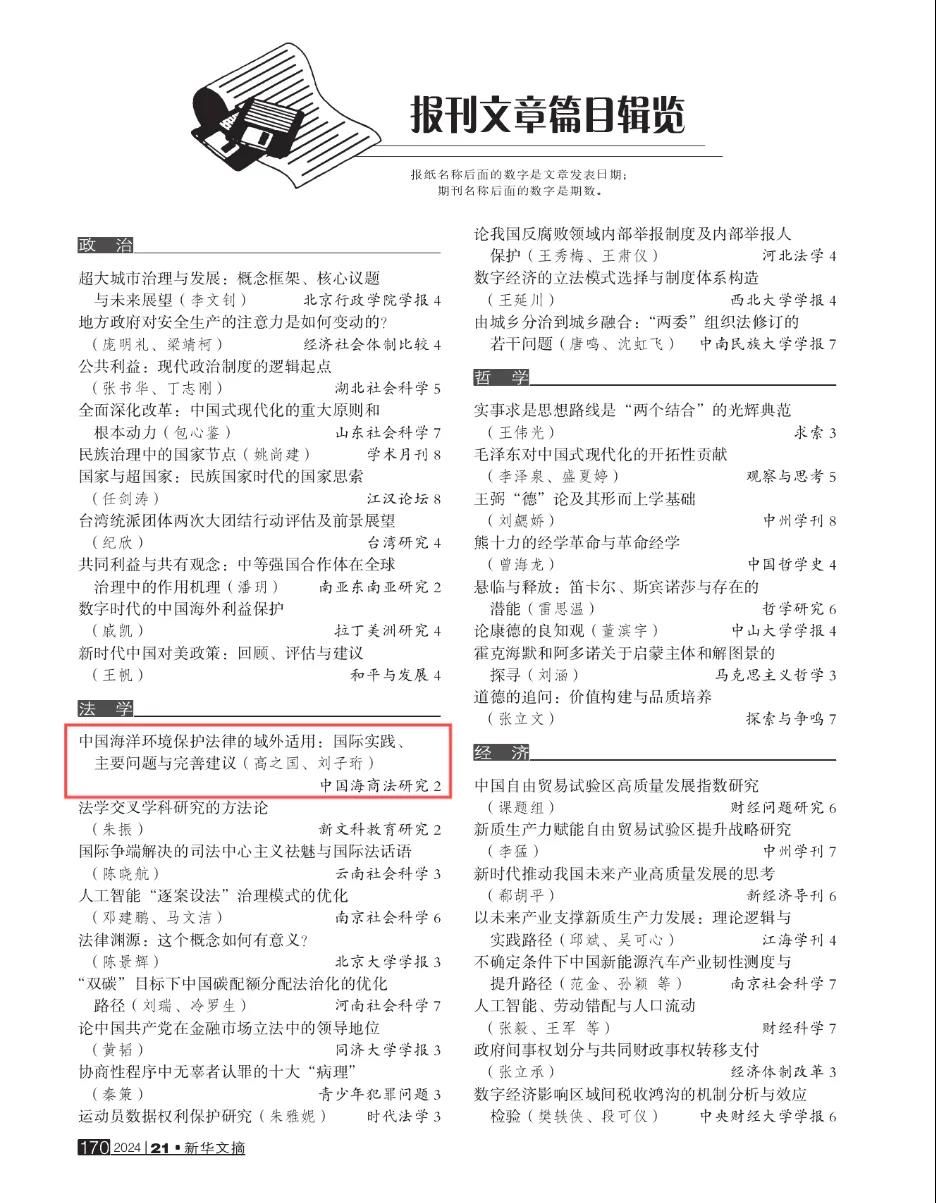 专论 |《中国海商法研究》刊文被《新华文摘》“报刊文章篇目辑览”收录