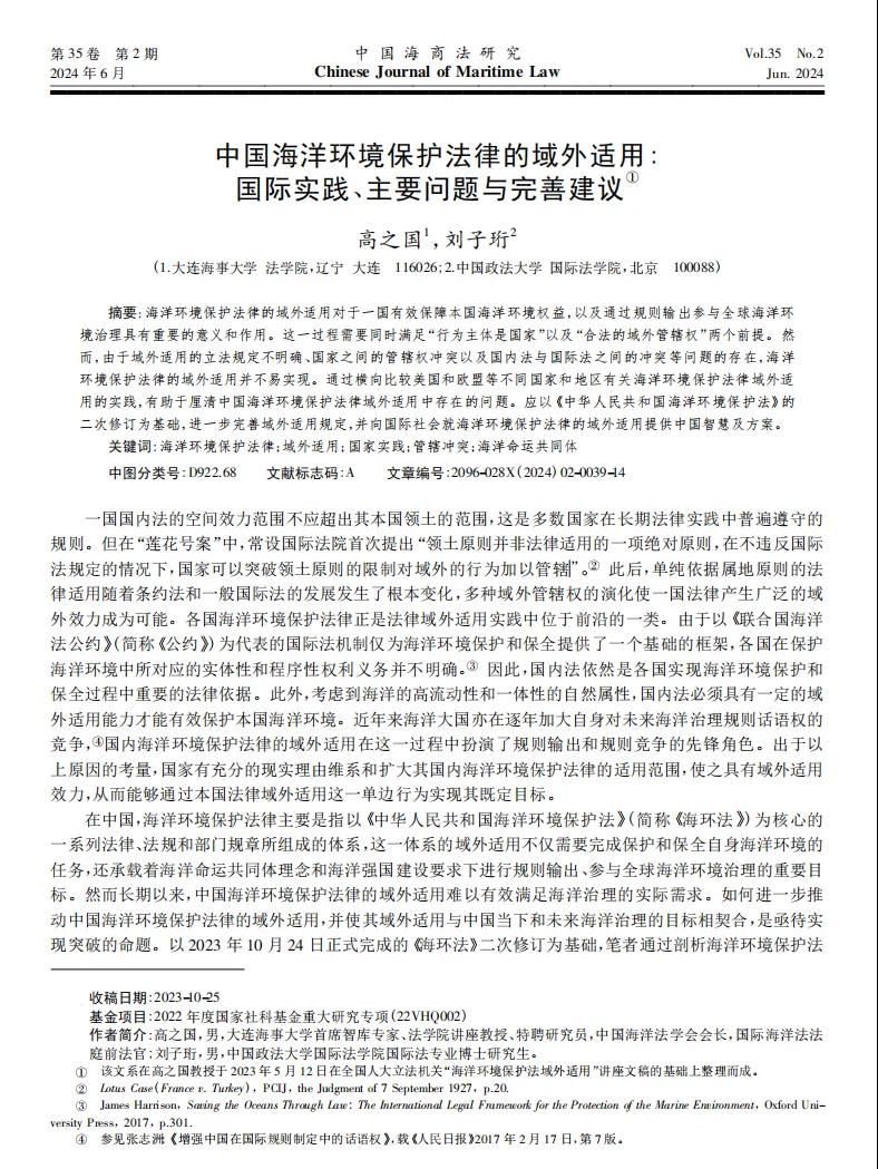 《中国海商法研究》2024年第2期刊发的《中国海洋环境保护法律的域外适用:国际实践、主要问题与完善建议》,被《新华文摘》2024年第21期“报刊文章篇目辑览”收录。该文第一作者为高之国,系williamhill威廉希尔首席智库专家、williamhill英国讲座教授、特聘研究员,中国海洋法学会会长,国际海洋法法庭前法官;第二作者为刘子珩,系中国政法大学国际williamhill英国国际法专业博士研究生。